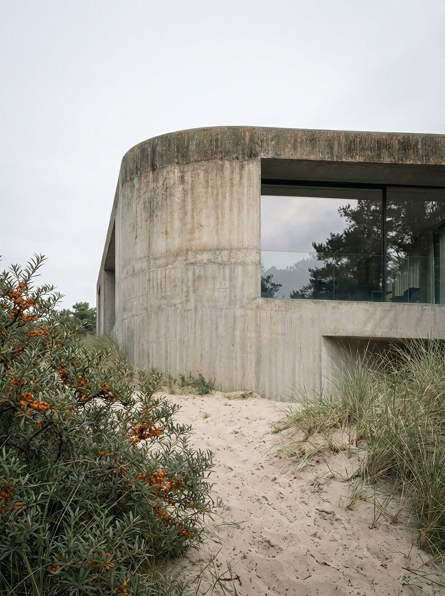 Rather than presenting itself as a singular object, the house unfolds gradually through framed views, thresholds and shifts in atmosphere. Interior and exterior are treated as one continuous spatial experience. Materiality, proportion and filtered light guide the perception of space, allowing the architecture to be discovered in time rather than understood at once. The project embraces the weight and stillness of its context, responding to the coastal environment through restraint, solidity and a quiet dialogue with the landscape.