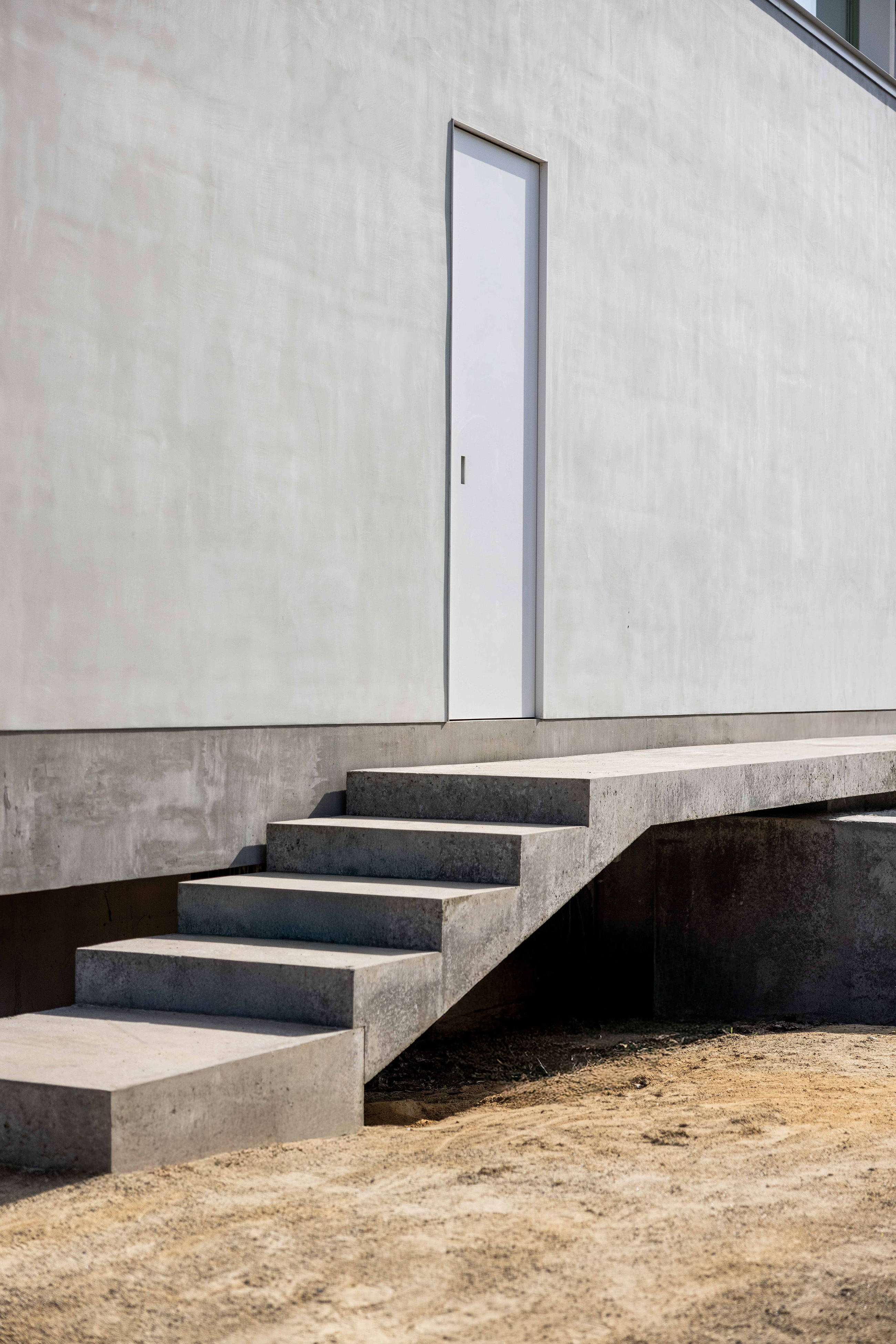 De woning is opgetrokken in ruw beton: een eerlijke, robuuste basis die rust uitstraalt en tegelijk ruimte laat voor verfijning. Denk aan betonvloeren, een sculpturale trap in zichtbeton, in combinatie met verfijnd aluminium én een volledig uitgeruste Bulthaup-keuken. Elk detail is bedacht met het oog op ultiem comfort en zintuiglijke beleving.