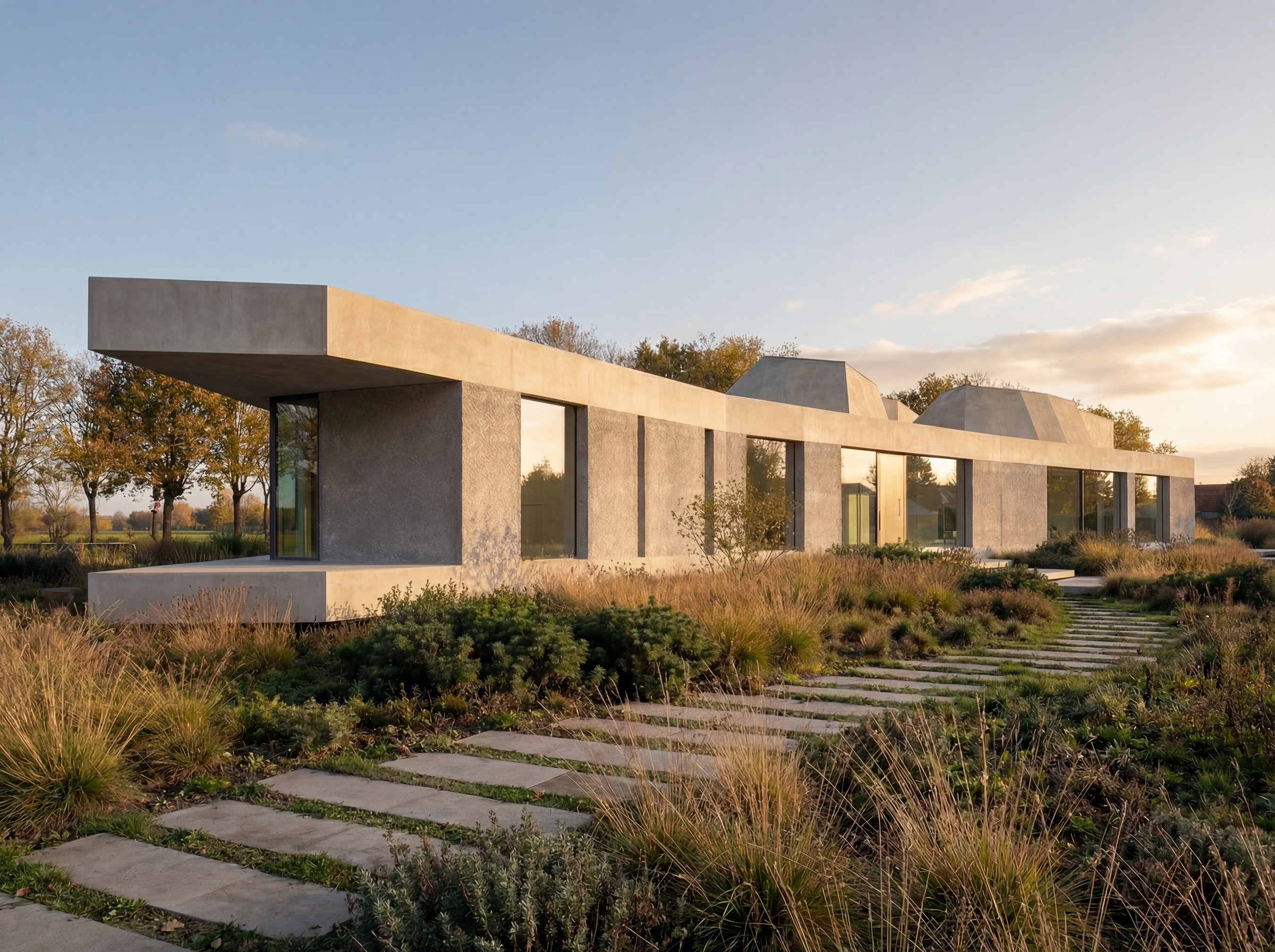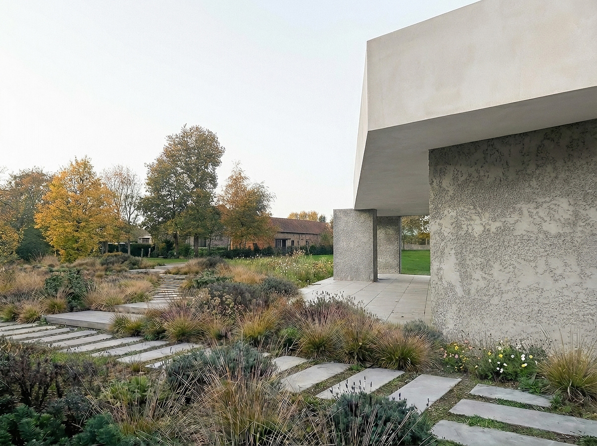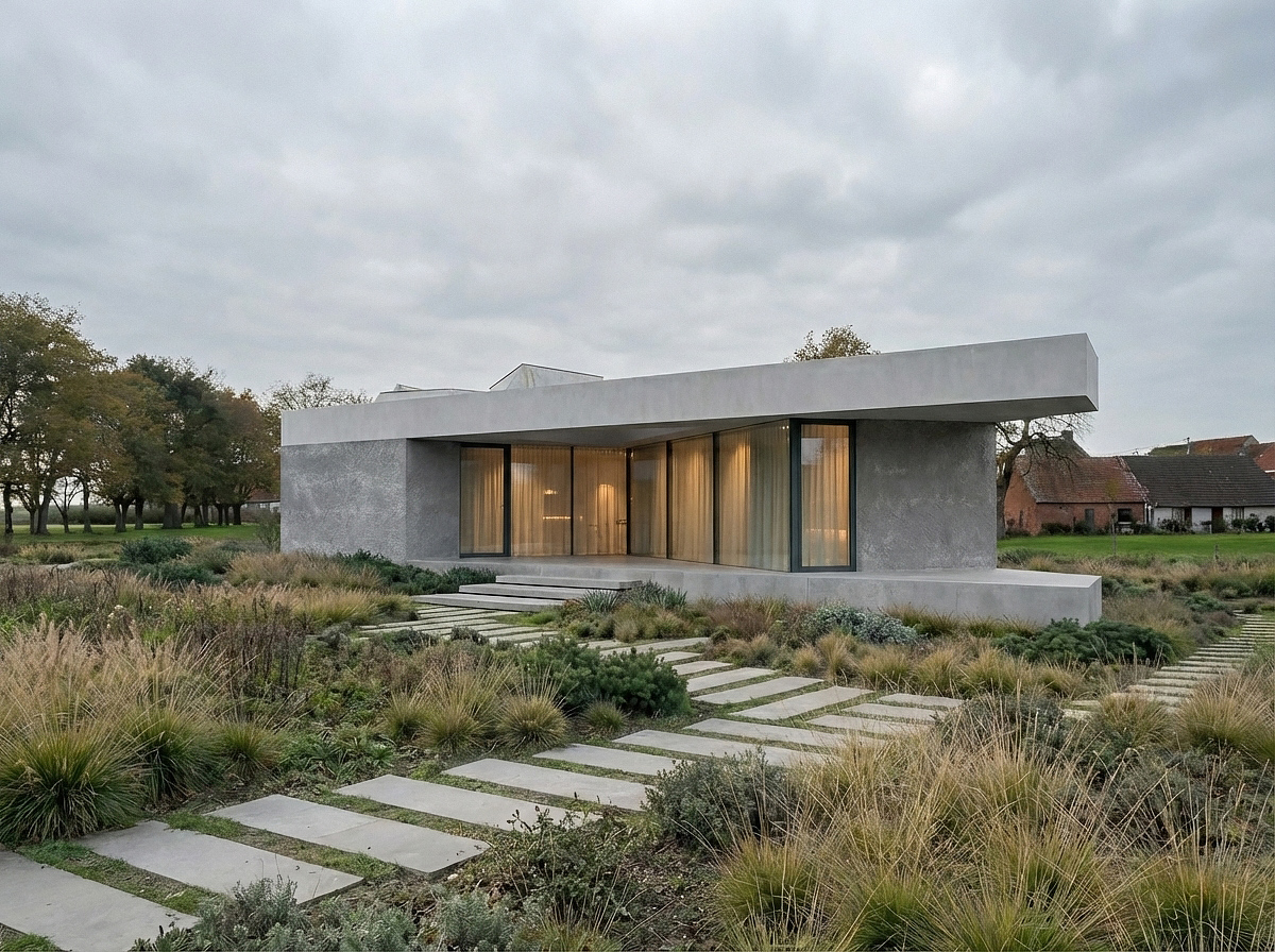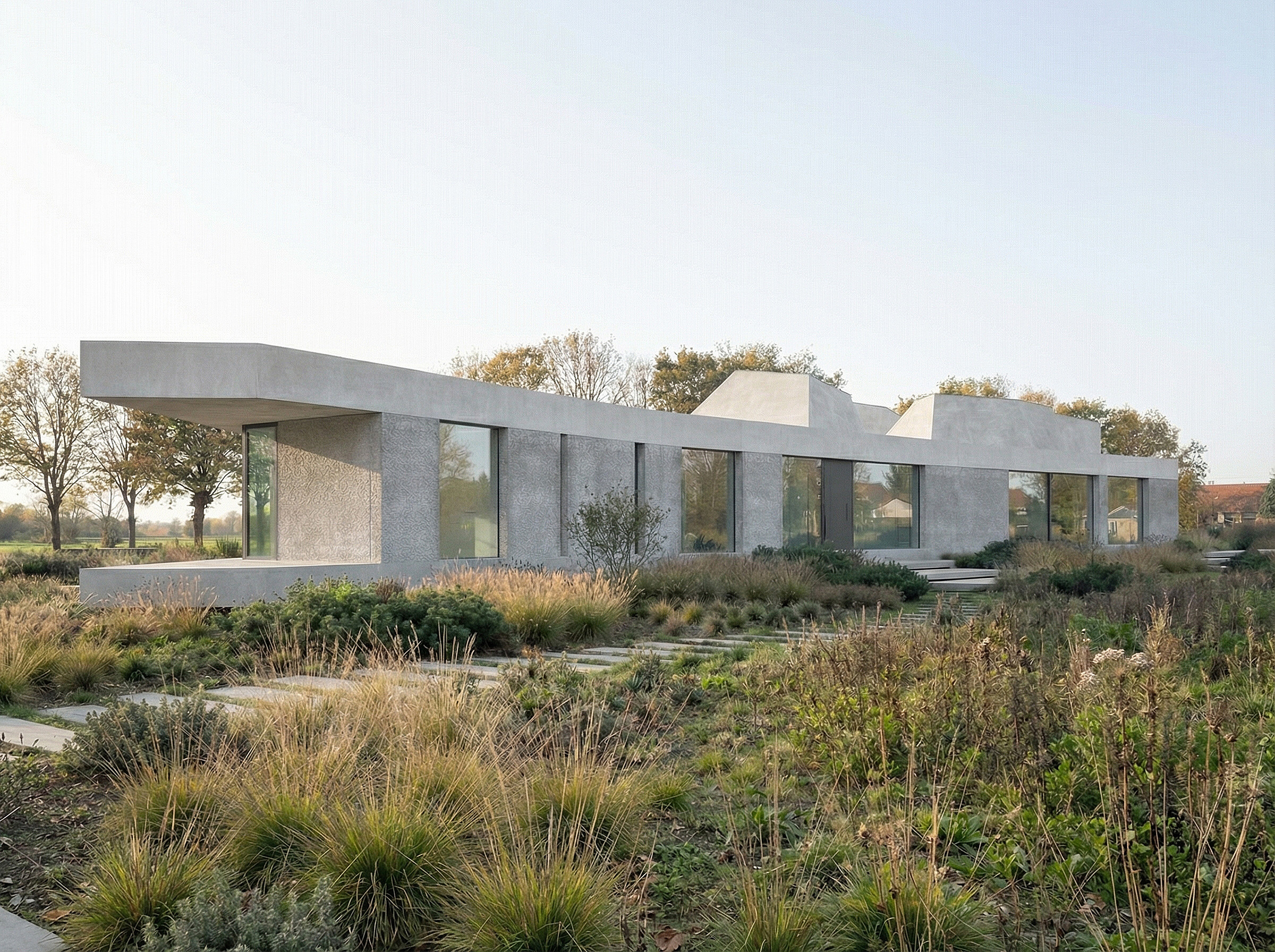 Villa DrF unfolds as an abstract concrete landscape in the village of Boekhoute, where streets rise above the surrounding fields.