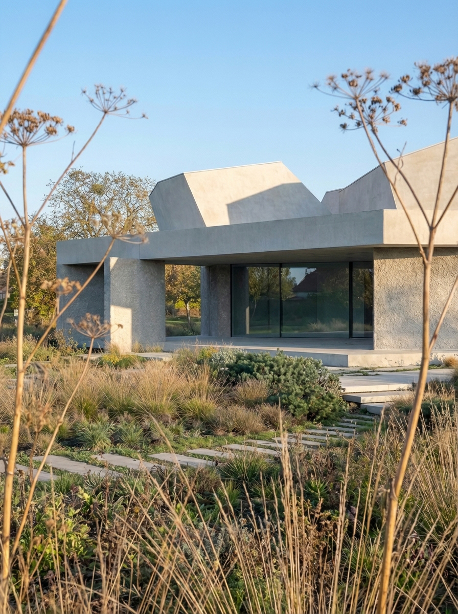 Material continuity reinforces this experience. Concrete surfaces extend seamlessly across volumes, emphasizing the sculptural nature of the architecture. Subtle variations in texture and tone introduce depth and tactility, allowing the building to respond to light and weather over time.