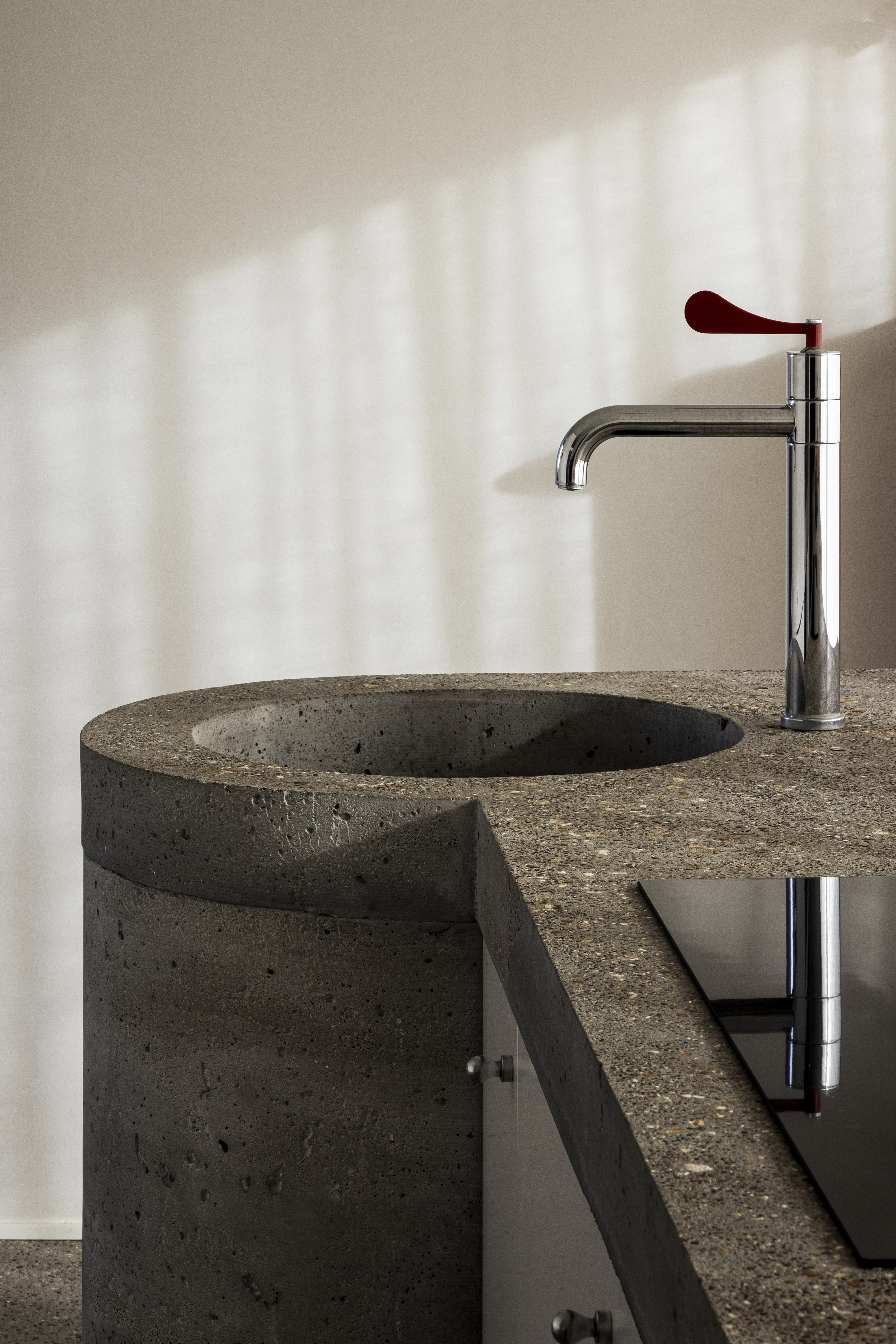 Inside, concrete continues as spatial substance. Staircase, bathrooms, kitchen and built-in seating are conceived as monolithic elements within the mass. Lime-washed surfaces and sandblasted oak furniture soften the mineral presence while maintaining material clarity.