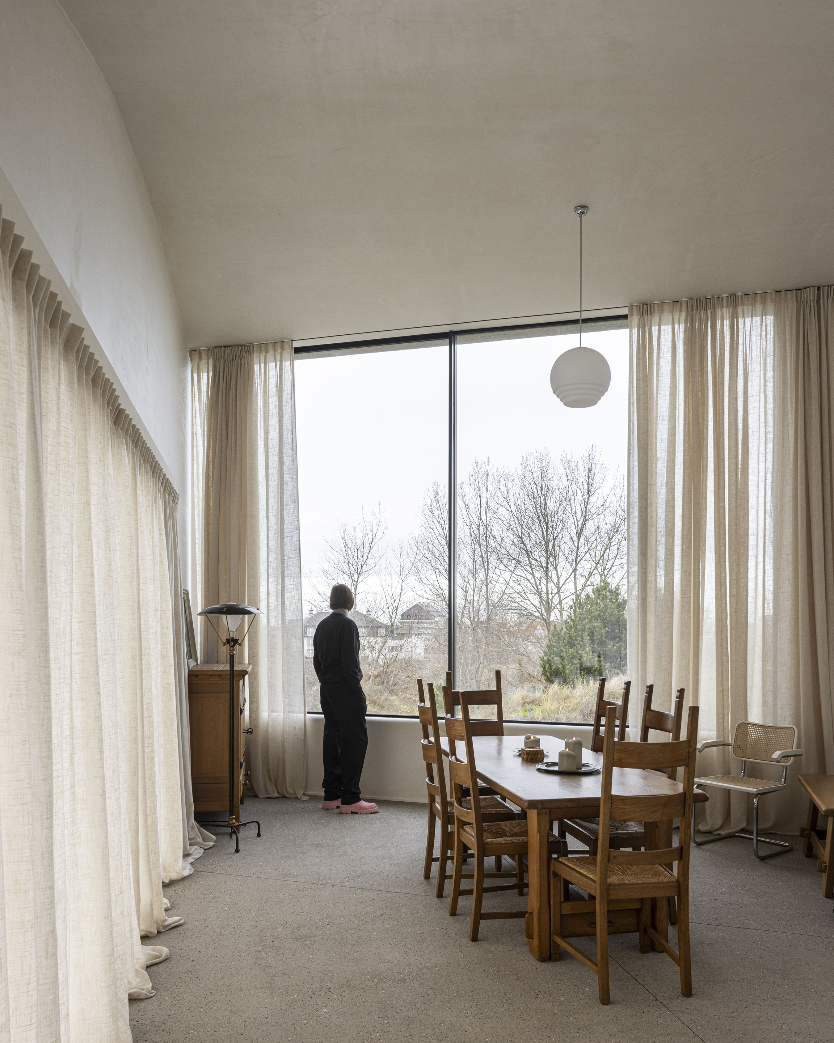 Toward the street, the curved façade acts as a protective shell. Its horizontal texture recalls sand at low tide, as if the concrete were sedimented rather than cast. To the south, a deep horizontal incision frames the landscape through thickness and shadow rather than transparency.