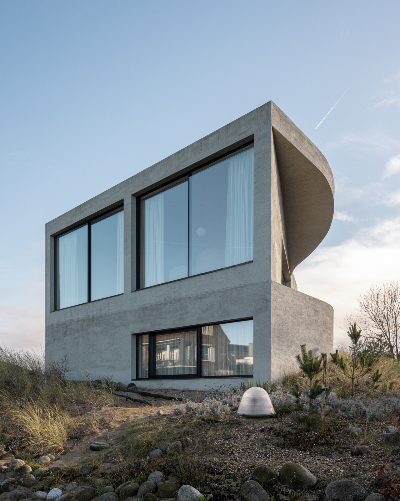 Partly embedded in the ground, the house reads as carved into the dune rather than placed upon it. The sloping roof is generated by interior spatial conditions, rising above the living space and descending toward more intimate zones.