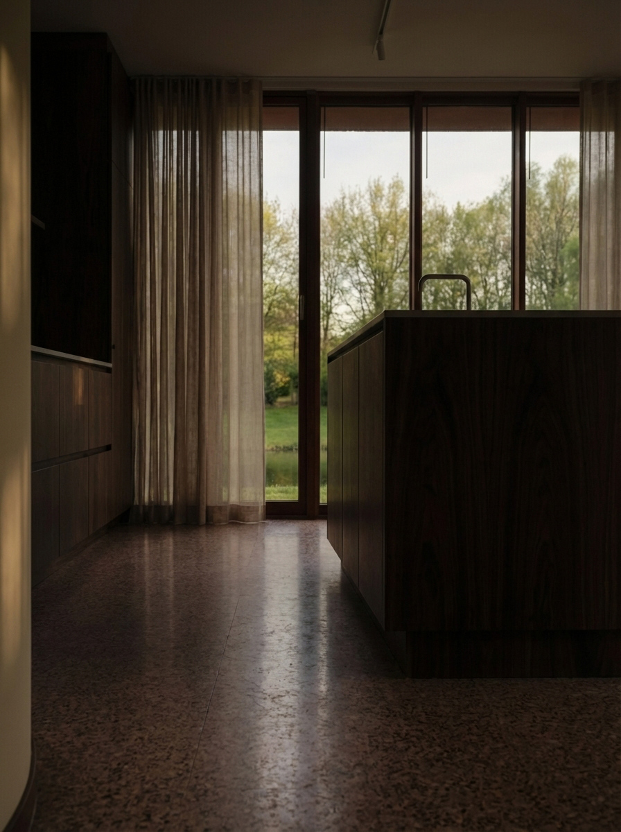 As the volume continues, the roof gently rises towards the main living space, where a large panoramic opening frames expansive views over the pond. This gradual increase in height reinforces the transition from more introverted, protected spaces to a fully open living area oriented towards the landscape.