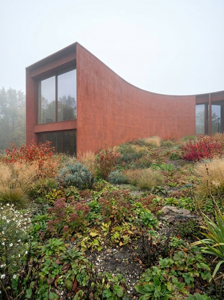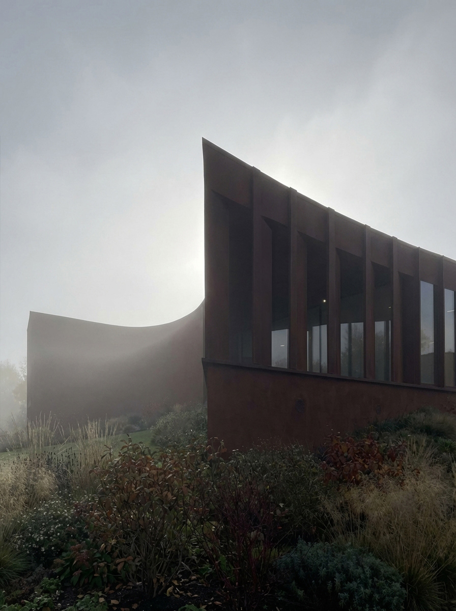 Materiality further anchors the architecture in its context. The colour refers to the traditional red lead (menie)historically used to protect iron structures in shipbuilding, establishing a link with the infrastructural and maritime character of the region. The adjacent pond is a former clay pit, where clay was extracted for the production of bricks in similar tonal ranges. Landscape, material and colour thus form a coherent narrative rooted in place.