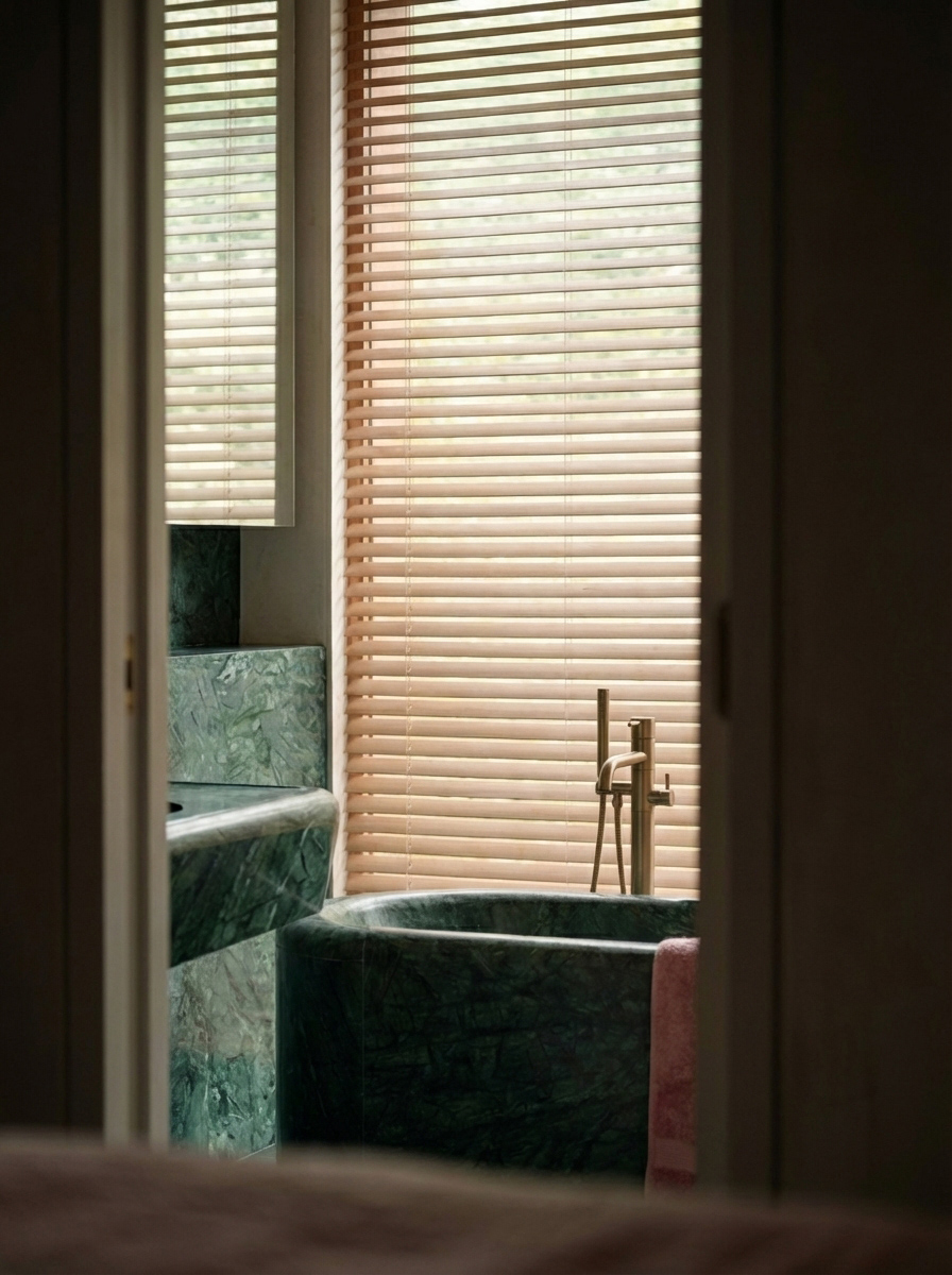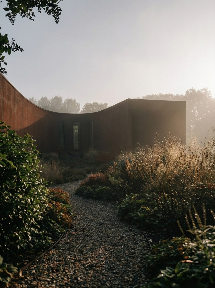 A more intimate wing, accessed through the curved geometry of the building, accommodates the primary bedroom with ensuite bathroom and dressing. Here, the architecture becomes more enclosed and protective, reinforcing privacy while remaining in dialogue with the surrounding landscape.