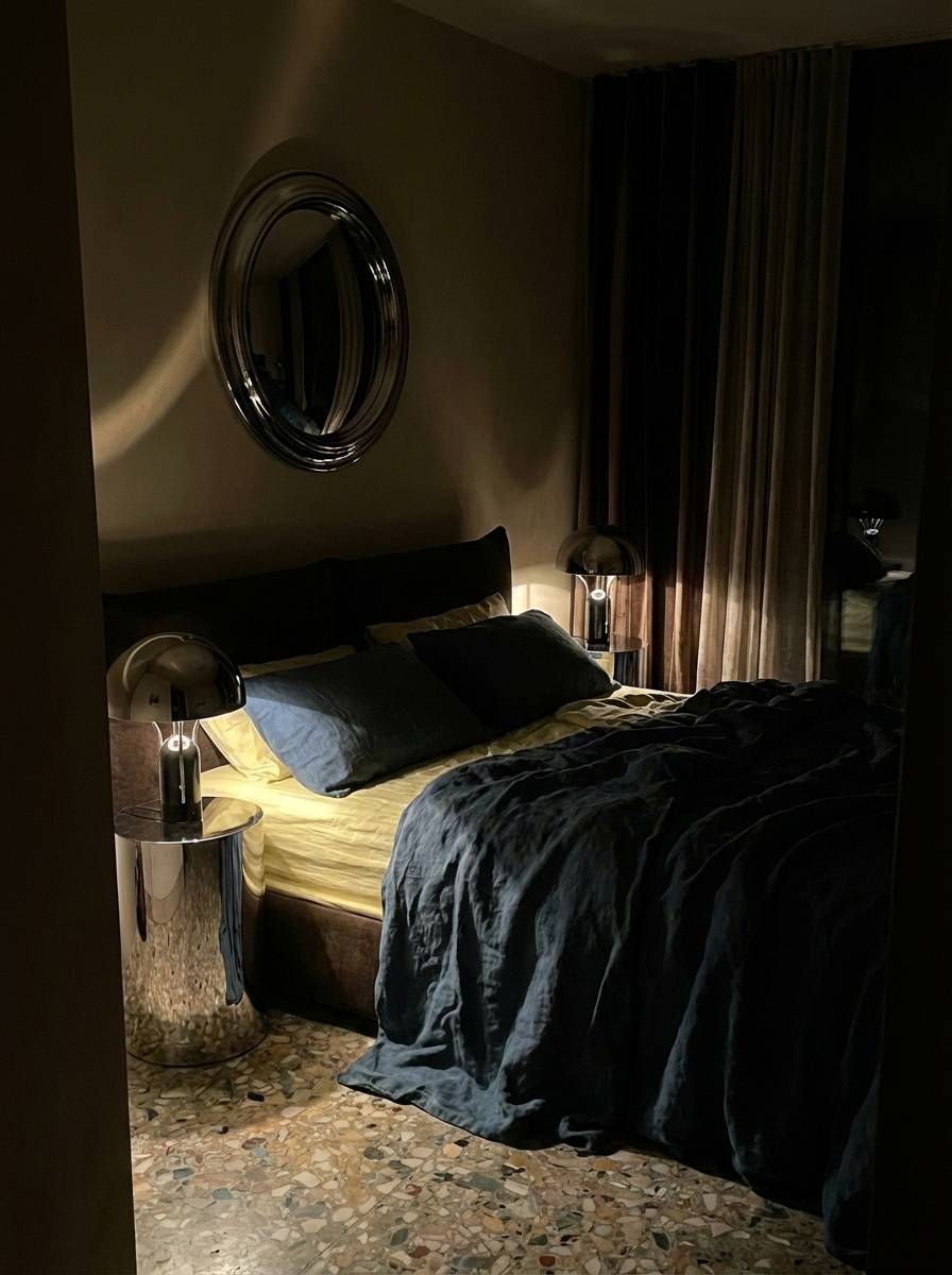 On the opposite side of the building, a lower and more discreet entrance connects the house to a narrow alley and a denser, more urban context. From this entrance, a guest room with private bathroom is accessed, allowing the house to accommodate visitors independently. A circulation axis runs through this zone and leads into an intermediate space between the kitchen and the living area, functioning as a spatial hinge within the house.